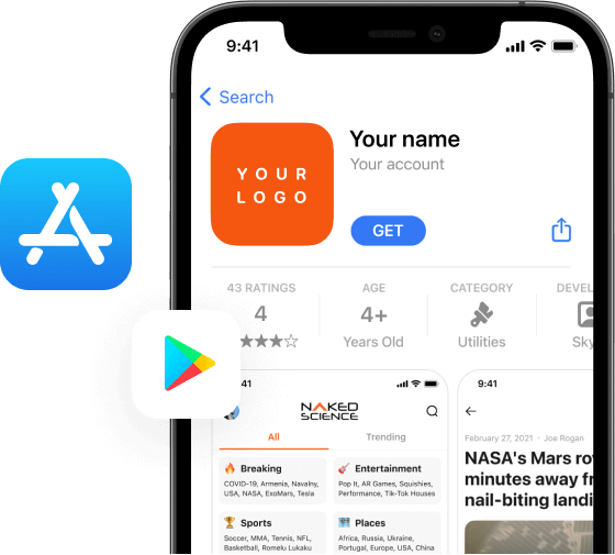 Приложение вы грузите через свой собственный аккаунт в AppStore и GooglePlay.